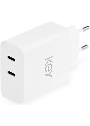 Smart vægoplader fra KEY som understøtter hurtigopladning og kan oplade 2 enheder på samme tid.